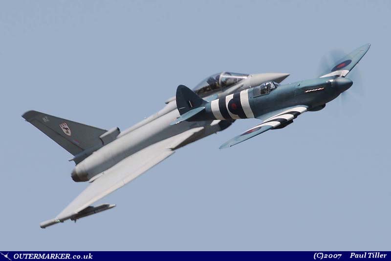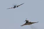 The flying display commenced promptly at 11:45, with the unique formation of the BBMF's Spitfire PR.XIX and Typhoon F.2 from 29(R) Sqn flown by the 2007 display pilot, Flt Lt Jim Wallis, to celebrate the 50th Anniversary of the BBMF. This was highly appropriate based on the fact that Biggin Hill is considered to be the BBMF’s spiritual home as it was formed back in July 1957, at RAF Biggin Hill as it was known then, as the Historic Aircraft Flight with one Hurricane Iic and three Spitfire Mk XIXs. Following a series of close formation flypasts, the Typhoon rolled in to its solo display. |