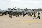 On a day with unusually warm temperatures for early March and with winds gusting up to 30mph, at approximately 9.50am the first squadron appeared in the Oceana skies. The eleven F/A-18C’s of VFA-15 “Valions” approached the base from the north east in a diamond formation, with faces turned to see them and fingers pointing, the formation made its fly-by to the cheers and clapping of the those gathered at their hangar. The arrowhead formation then split into smaller three and four jet formations which each made another fly-by and then each jet peeled away to make its approach for landing. One by one each jet touched down on the runway and after a brief wait they taxied to their ramp parking positions in pairs. The ground crews had been in position on the ramp awaiting the jets for some time and slowly, one by one, each jet parked up. Interestingly, some of the jets were carrying armaments on their pylons and noteworthy were those aircraft carrying SLAM-ER, AGM-88 HARM, AIM-7 Sparrow and AIM-9X Sidewinder missiles. With all the squadron jets parked up, engines were shut down and canopies were opened. As the crews unstrapped themselves and began to exit their jets, they were greeted by their families and friends who rushed onto the ramp, families were again re-united. |